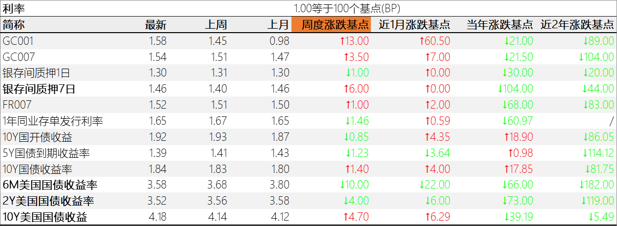 本周市场利率普遍下行,资金面宽松。中美无风险利差-2.27%,处于倒挂状态,负利差扩大。短端利率更强。