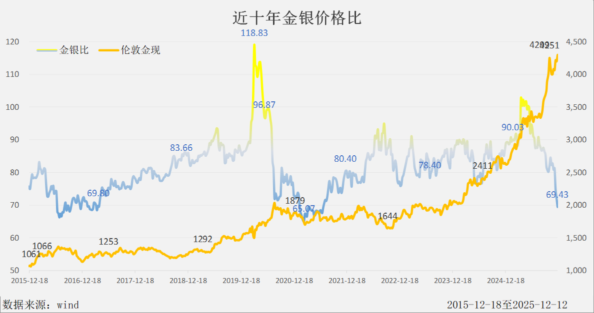 金银价格比为69.43有所下降,白银相对黄金更强势。