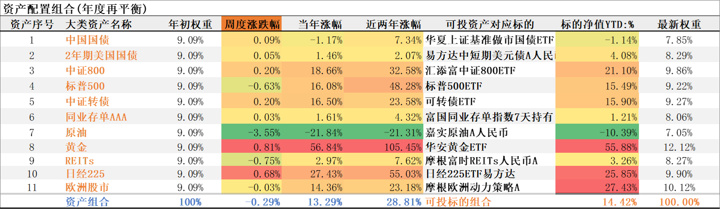 考虑到场内和场外的可选标的均无法很好实现我们的大类资产配置组合,场内是缺少REITs和欧股等资产的标的,场外是因为部分标的的申购额度限制,以及ETF联接基金大幅跑输ETF本身。因此,我们仍然选择场内场外品种兼有的方式完成2026年的组合,仍然使用等权的方式。