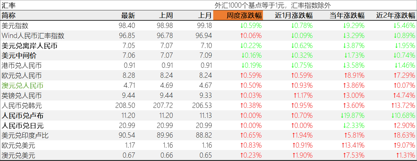 汇率方面,美元指数和人民币指数分别跌0.59%、和涨0.06%。美元相对人民币周贬-0.22%,而美元兑人民币中间价本周贬-0.16%。主要货币兑人民币升值最多的是欧元,贬值最多的是韩元。