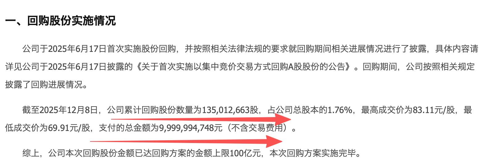 这段时间,公司回购了1.35亿股,回购了100亿元,回购全部用于注销。