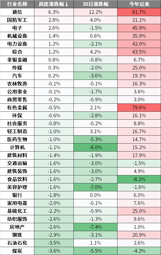 本周申万一级31个行业涨跌参半,通信、国防军工、电子等板块涨幅居前,煤炭、石油石化、钢铁等板块收跌。