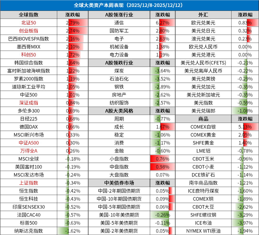 权益市场方面,本周权益市场震荡下行,上证指数周一延续上修复趋势,随后周内连续走弱,但在周五又实现了一定的修复。板块方面,科技叙事修复下,周内资金继续涌入AI算力板块,光模块、PCB和半导体设备相关板块领涨;商业航天板块延续上周涨势,周内持续表现;此外,电网设备板块等后半周走势较强。港股方面,恒生指数和恒生科技均先下后上,震荡走弱。美股方面,本周标普小幅震荡上行,纳指全周震荡。