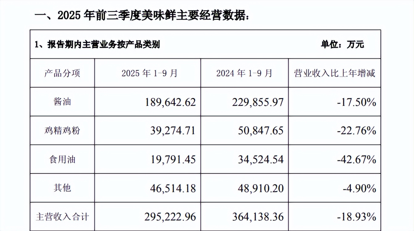 追其原因,核心品类增长乏力是主要推手。前三季子公司美味鲜实现营收31.07亿元,同比减少18.40%,主要受调味品销售下降影响。