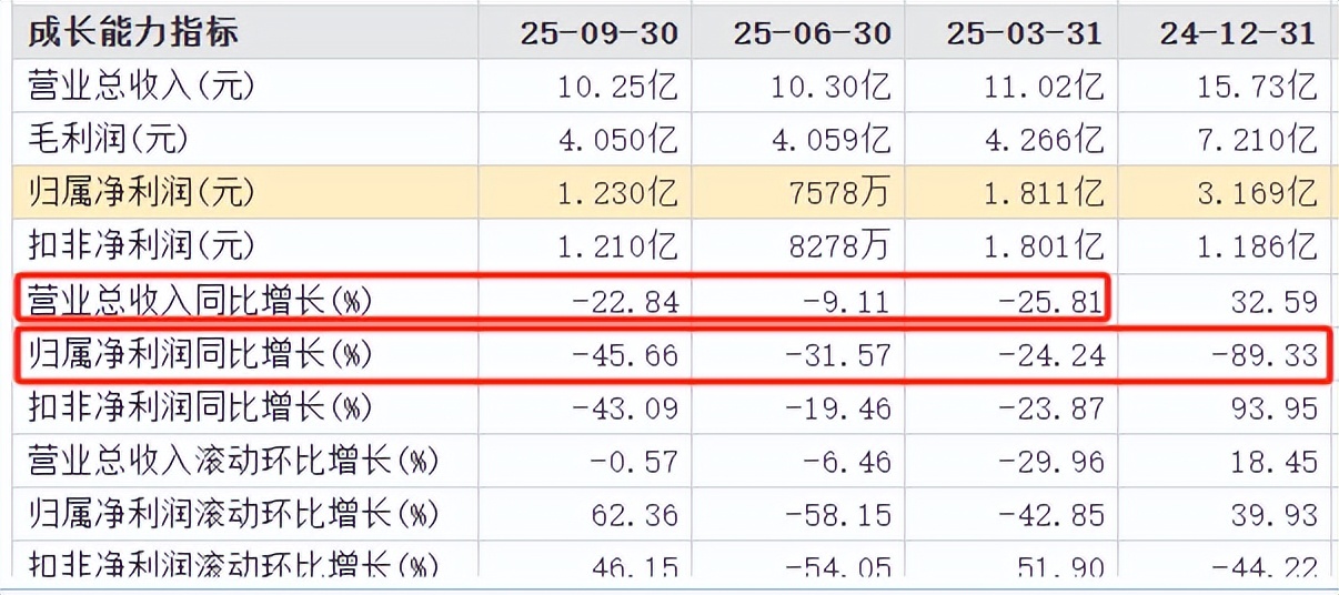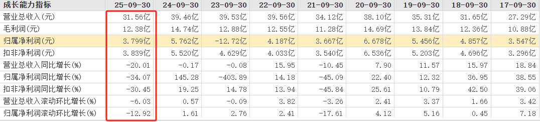以最新季报为例,2025前三季公司营收31.56亿元,同比下滑20.01%;归母净利3.799亿元,同比降幅34.07%,扣非归母净利下滑30.45%至3.839亿元,为近八年同期最低,基本回到2018年水平。