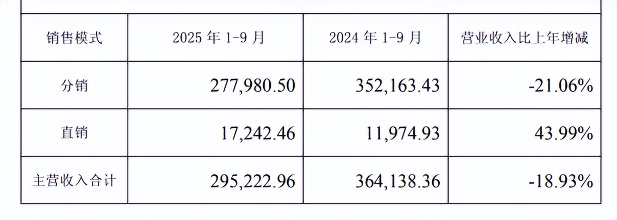 分区域来看,前三季东部、南部、中西部、北部分别下滑28.21%、17.48%、14.68%、12.78%,即疲软态势具有普遍性。分模式看,贡献主收入的分销同比减少21.06%,好在直销同比增长43.99%,可由于占比较小,对总收入拉动作用微弱。