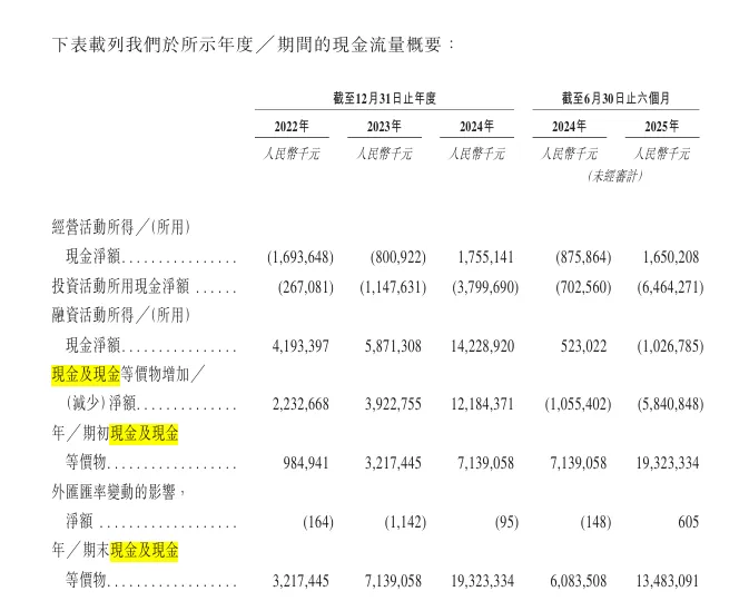 招股书显示,2023年公司经营活动现金净流出8.01亿元,2024年虽短暂转正至17.55亿元,但主要依赖销售回款周期缩短,并非盈利性流入;2025年上半年现金储备较年初减少58.41亿元,相当于每月平均消耗近10亿元。