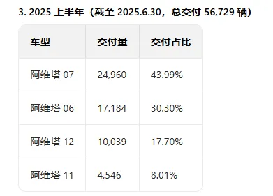 2024年,阿维塔销售为6.16万辆,是同期理想汽车销量的12%;2025年上半年5.67万辆的销量,仅为零跑销量的26%。细分市场表现同样乏力,2025年第二季度,其主力车型阿维塔06在20万元以上新豪华新能源中型轿车市场份额仅10.4%,阿维塔07在同级别SUV市场份额不足7%,均未形成爆款车型支撑。