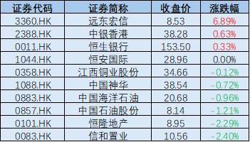 标普港股通低波红利指数前十大成分股今日表现
