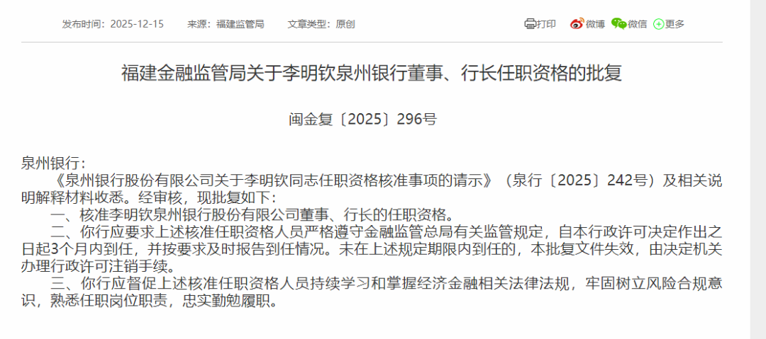 李明钦获批出任泉州银行行长,意味着该行核心高管层再次迎来调整。