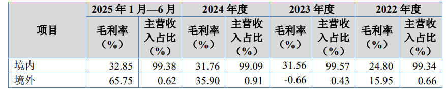 创达新材的毛利率波动情况异常显著,远超行业常态,引发了监管对其财务操纵的质疑。2022-2025年上半年,创达新材主营业务毛利率分别为24.75%、31.42%、31.8%和33.05%,持续上升。其中,电子封装材料毛利率从24.83%飙升至33.23%,环氧模塑料毛利率更是从9.96%暴涨至29.2%。再从销售区域看,创达新材境外销售毛利率分别为15.95%、-0.66%、35.9%和65.75%,虽然境外收入占比很少,但毛利率波动异常且与境内毛利率差距极大。