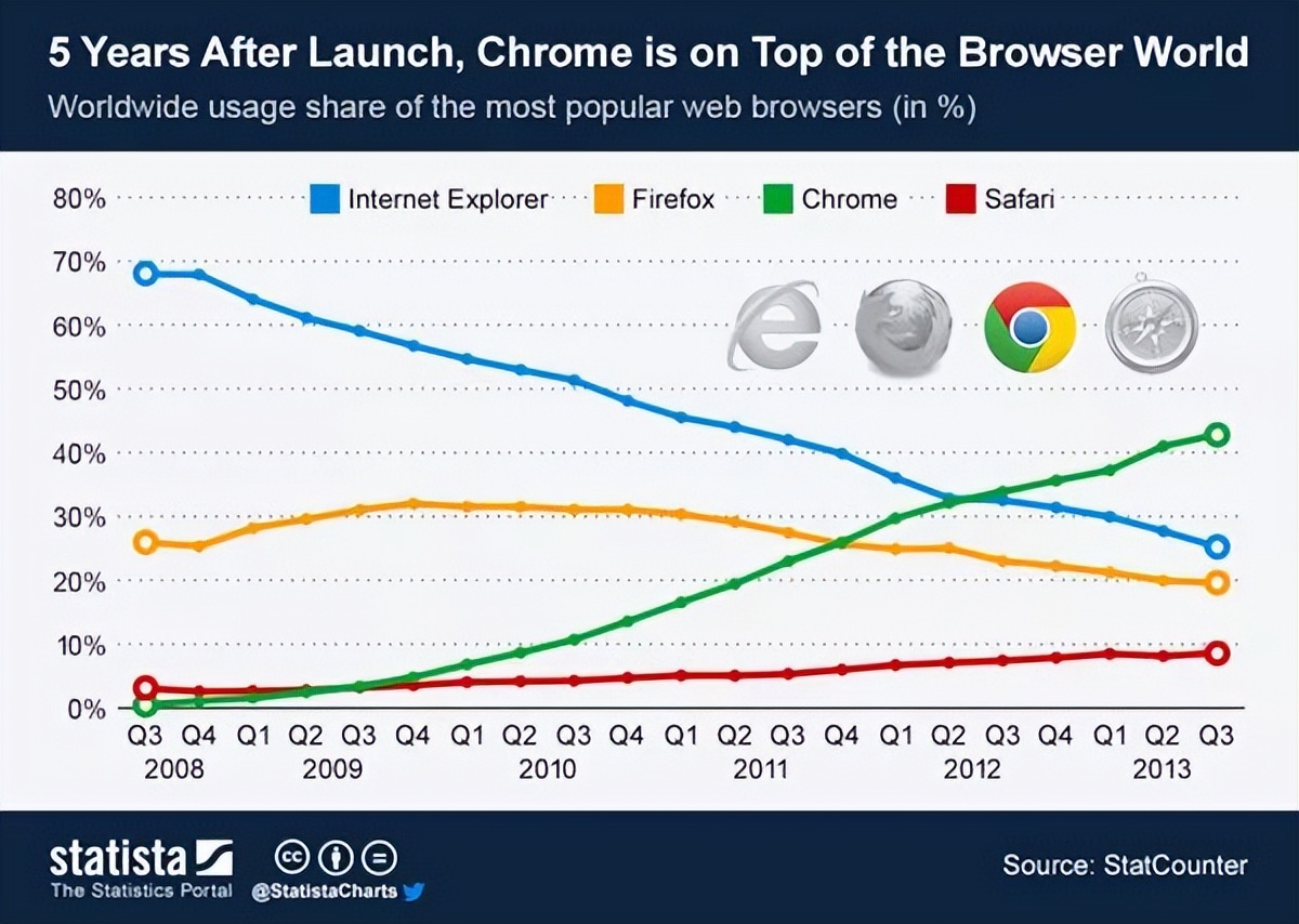 2008年9月,整合了谷歌搜索以及全家桶服务的Chrome浏览器正式上线,初始市场份额只有1%,而IE浏览器的份额是66%;五年以后,Chrome超越IE和火狐,成为全球第一大浏览器。在此期间,皮查伊也顺利进入谷歌核心高管层,出任Chrome业务高级副总裁。
