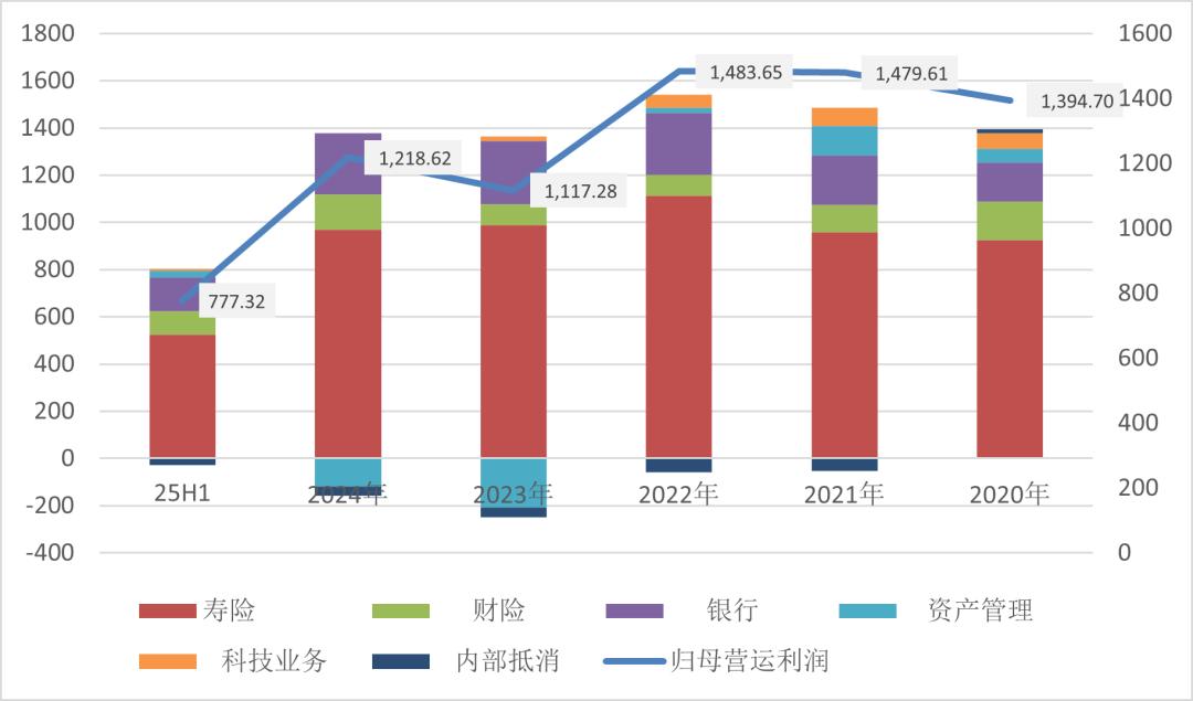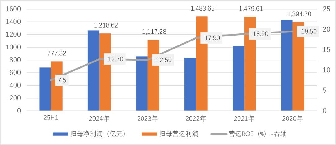 中国平安归母营运利润表现总体稳健,2020年至2022年营运ROE介于17.9%至19.5%之间。2023年及2024年,受地产拖累及低利率环境影响,该指标回落至12.5%左右;2025年上半年为7.5%。