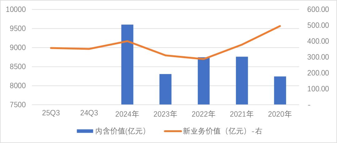从保单继续率来看,中国平安20年、21年、22年为低谷期,23年及以后修复明显。公司内含价值在不断提升,24年末寿险业务内含价值9606.08亿元,较21年增长了16.5%。25年前三季度新业务价值357.24亿元,同比增长1.6%,主要是低利率环境下息差收窄所致。