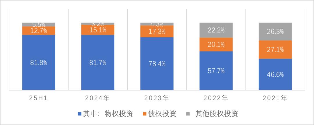 从结构看,物权投资占比从2021年的46.6%,大幅提升至2025年上半年的81.8%,债权投资及其他股权投资相应收缩。