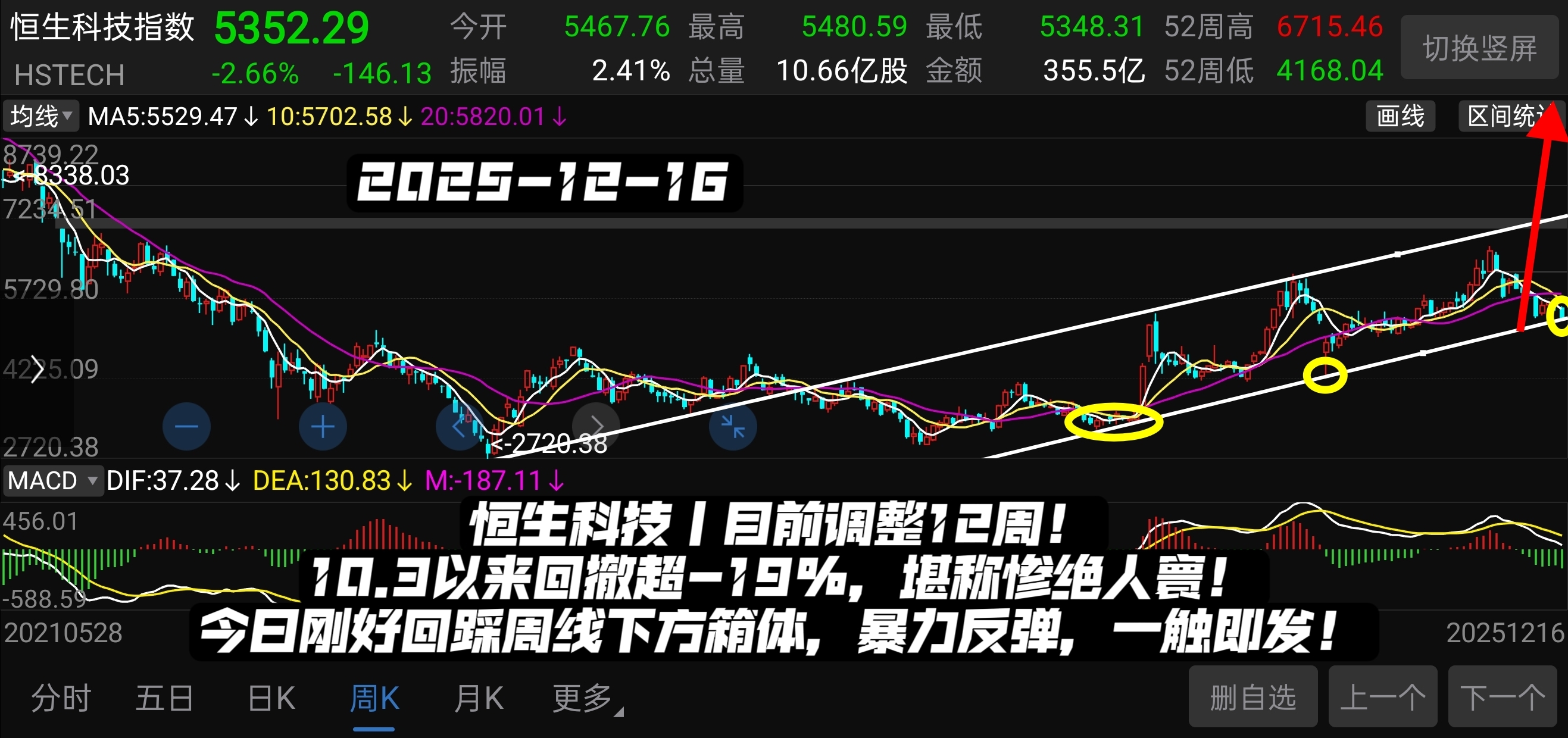今天【恒生科技】跌近-2.0%,最低打到5348,再创本轮调整新低,与11月21日前低5361形成双底!当前已调整12周,时空蓄势充分,今日刚好回踩周线下方箱体,直接一步到位!所以阿心左侧再度翻倍加仓一笔,知行合一!希望今天是最后一跌,这个位置市场随时会突然拉升,暴力反弹,一触即发!跨年行情随时启动,恒科反转趋势已近,积极乐观!能不能逆风翻盘就看这把了……加油,阿心一定能赢!