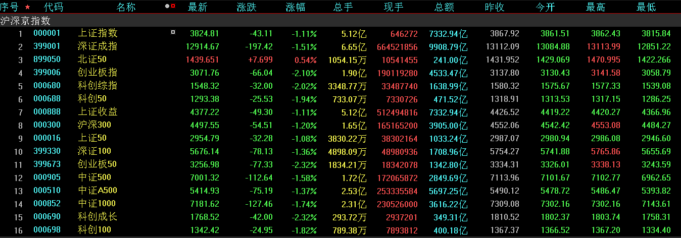 沪深二级市场正如此前一直在担心的,由于始终无法形成向上的趋势,继周一低开后反弹失败收成小的倒锤子形K线后,周二主要指数 开盘后维持弱势震荡下行格局,盘中几乎只有下探没有什么反弹,直至午后有两波小反弹也最终夭折。截至收盘,沪指收于3824.81点,跌1.11%,深证成指跌1.51%,创业板指跌2.1%,科创综指跌2.02,仅北证50小反弹0.54%。盘面上看,AEB概念、住宿餐饮、零售业、电子支付、智能汽车、数字货币等板块逆势领涨,福建国资、培育钻石、CPO概念、核聚变、稀土永磁等方向领跌。
