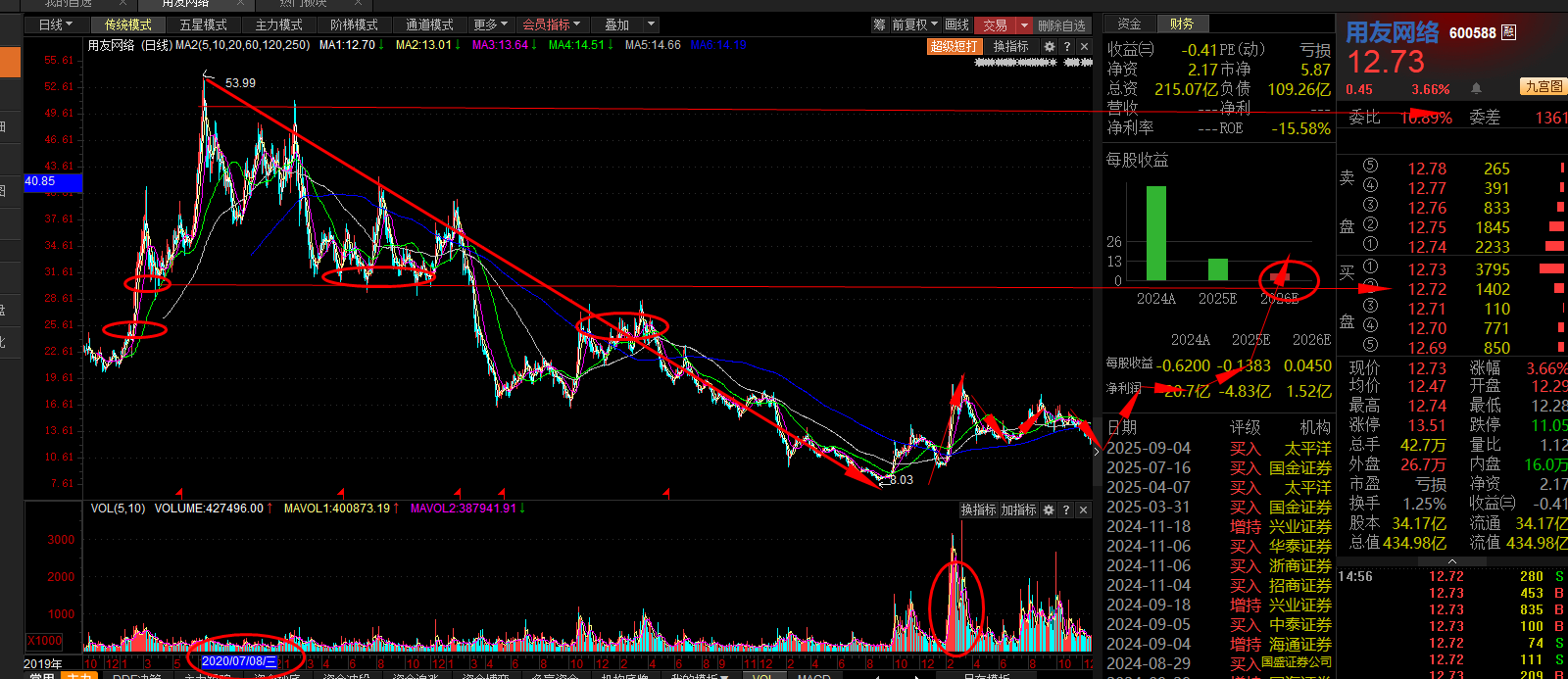 4:如果当时行情火爆,或者消息面刺激,——比如业绩形成拐点向上。甚至不排除用友直接会价格反转上涨到历史价格50元区域去。