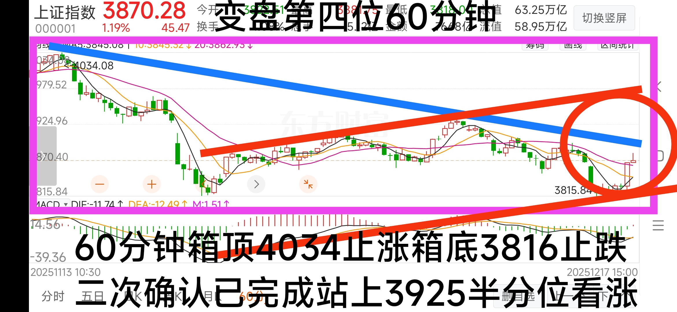 大盘60分钟上涨到箱顶4034止涨,回落到箱底3816开始止跌企稳,因为上涨没有站稳半分位3925,所以二次确认底部顺利完成,只要三天内不再破箱底再突破压力兰线后市看涨。