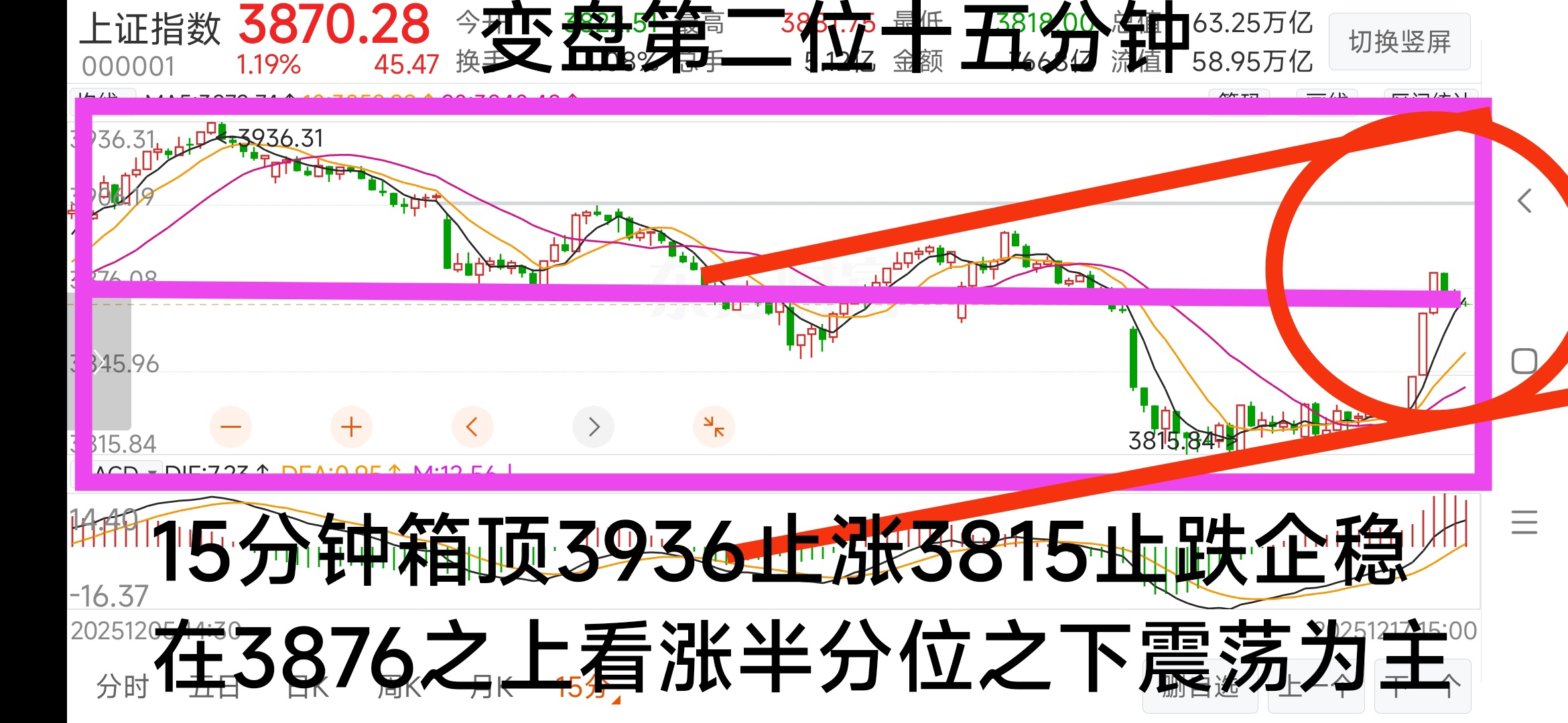 大盘从15分钟箱顶3936开始止涨,回落到3815止跌企稳开始向上运行,只要突破压力兰线站上3876半分位后市看涨。关心5分钟上涨强度的交化,如果止涨再失守5分钟20均线逢高减仓。