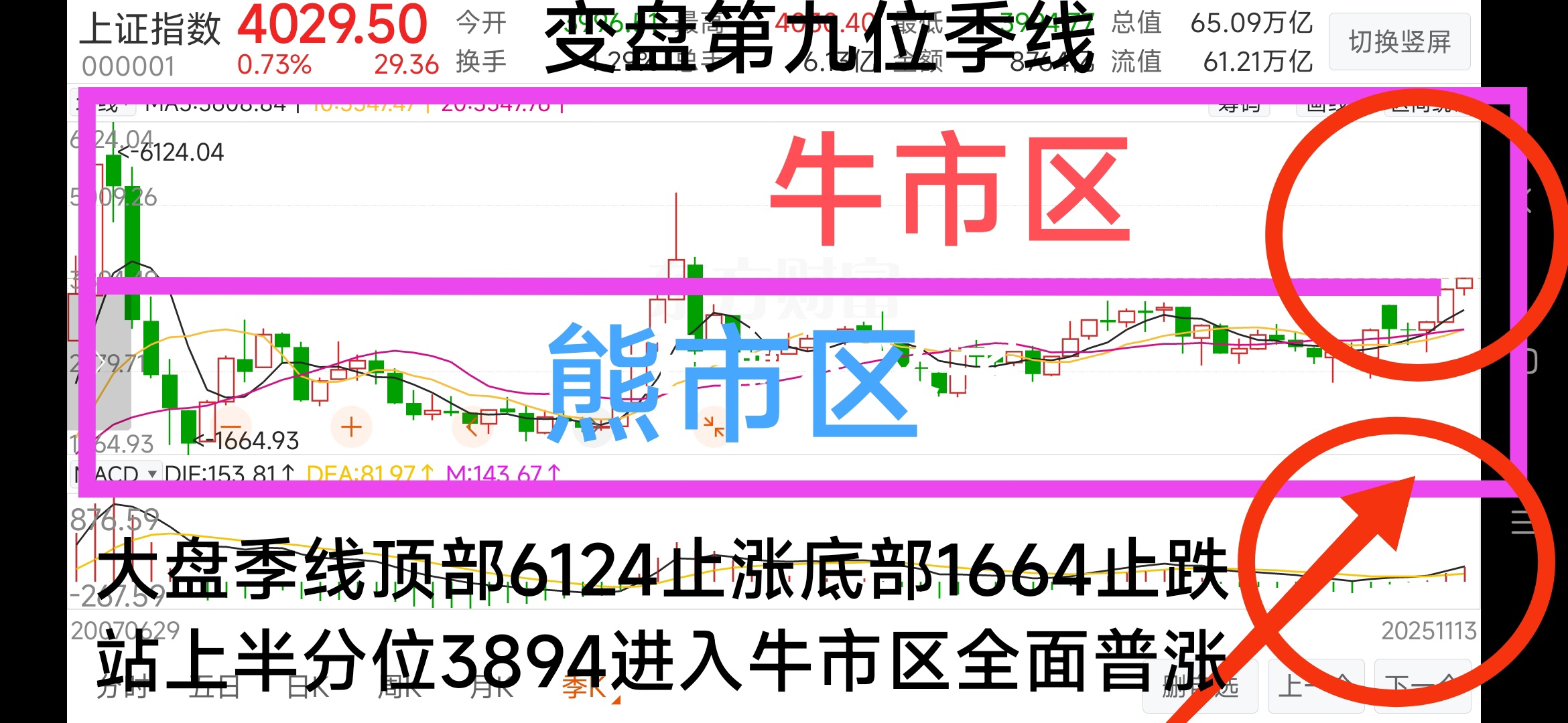 大盘跨进MACD季线红柱区刚刚才第三根,年初我判断年底能够突破半分位3894牛熊分界线,可喜的是已经提前跨进牛市区。【虽然暂时失守3894牛市分界线,待震荡修复之后很快再进入牛市区】目前大盘很弱在红柱区第三根季线应该收阴,第四根春季行情收阳希望很大。
