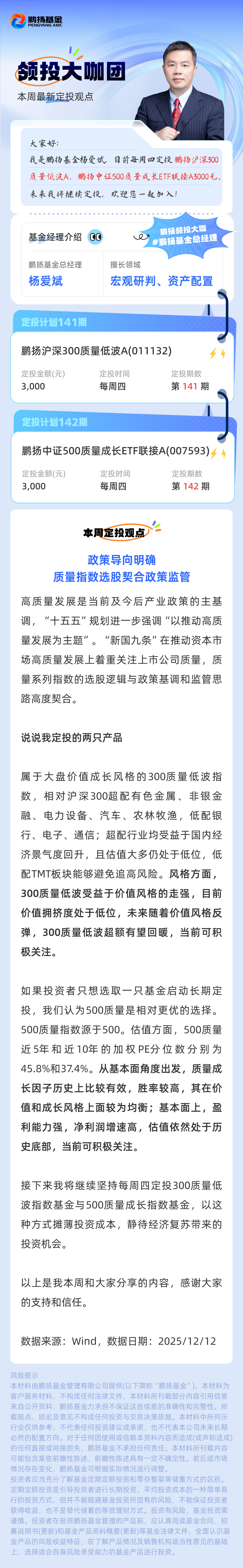 鹏扬基金杨爱斌:政策导向明确,质量指数选股契合政策监管(定投计划142期)