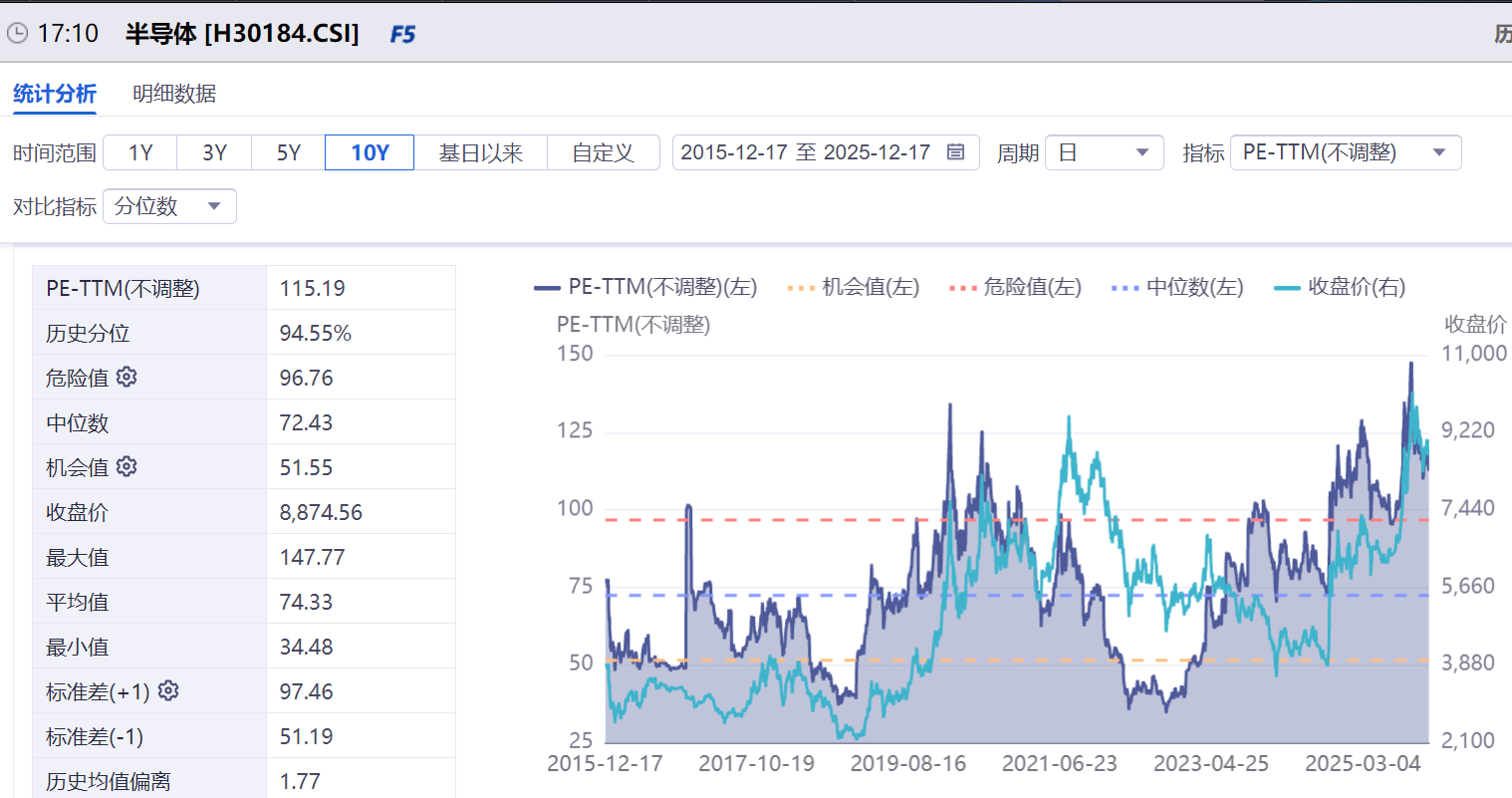 拿半导体指数为例,目前估值水平是115.19倍,在历史94.55%的估值分位水平,已经高于一倍标准差!