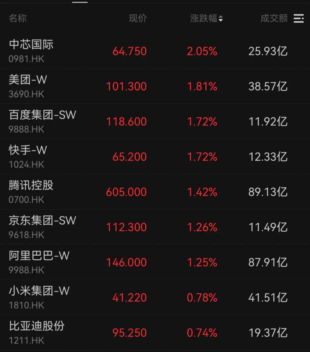大型科技股普遍回暖,美团、百度、快手、腾讯等分别上涨1.81%、1.72%、1.72%、1.42%。