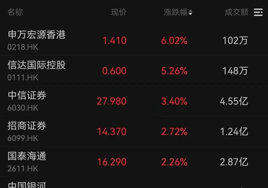 申万宏源涨超6%,信达国际、中信证券和招商证券分别上涨5.26%、3.40%、2.72%,中国人寿、新华保险、中国太保分别上涨4.31%、3.19%、3.04%。