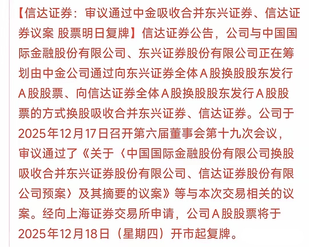 券商板块终于迎来重磅利好!酝酿许久的汇金系券商整合迎来关键节点——中金公司、信达证券、东兴证券将于12月18日正式复牌,这场剑指“航母级券商”的重组迈出实质性一步。不过需注意,此次披露的仅为重组预案,交易尚需经各方董事会、股东会审议及监管核准,仍处于推进流程中。