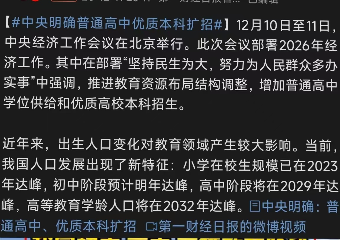 【中央明确普通高中优质本科扩招】12月10日至11日,中央经济工作会议在北京举行。此次会议部署2026年经济工作。其中在部署“坚持民生为大,努力为人民群众多办实事”中强调,推进教育资源布局结构调整,增加普通高中学位供给和优质高校本科招生。