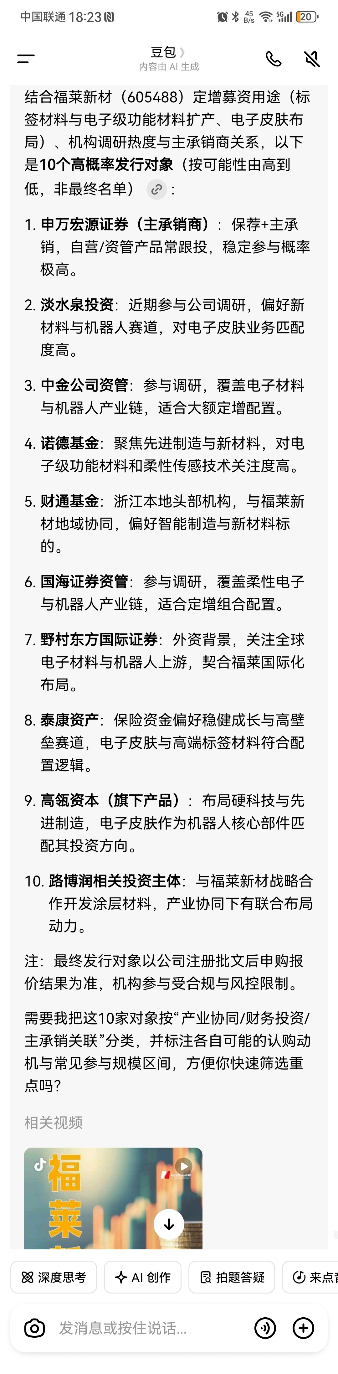 $福莱新材(SH605488)$ 不想股价问题,定增压价也是有心理预期的,现在最关键的就是增发对象,看这流程走的速度感觉证监会批准后就开始发行了,前段时间100多家机构调研然后股价也没怎么涨,现在看来都是盯着增发的大肉呢!大家分析一下可能性比较大得增发对象吧!我先来,我感觉通智科技很有可能,两家深入合作开发大模型,讲道理通智会入股福莱的,现在增发这好机会通智应该不会放过的!!!!认为我说的对的给个赞![呲牙 [呲牙]](http://gbfek.dfcfw.com/face/emot_default_28x28/emot21.png)