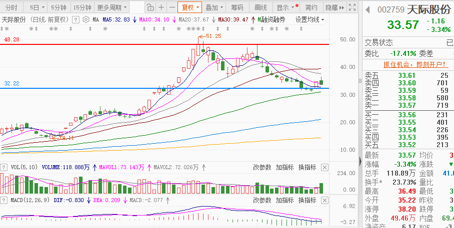 天际股份:昨天虽高开低走,全天放量调整,但整体还是有较强的资金承接的,继周三涨停板后昨天放量释放,可见主力控盘并不够强势,那么短期内预计还会回踩支撑的需要,还没上车的朋友可参考32块2左右的支撑位再低吸。天际股份专注六氟磷酸锂与次磷酸钠研发生产,以技术创新驱动化工材料安全供应。目前点解液行业需求旺盛,而化工原材料的涨价依旧有较强支撑,低位反弹可期。