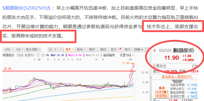 顺灏股份这波商业航天的发酵是一路高歌猛进,前面十二月初八哥有过分享梳理,前面就提到了顺灏是极具跨年妖的技术支撑,目前自低位涨幅翻倍,但随着商业航天的持续发酵,资金追捧。公司目是通过参股轨道辰光获得资金参与太空算力,逻辑够硬,短期高位有所分化调整,本周前三天持续调整,左右再度涨停,调整蓄势后有望持续连板,今天早盘可择机进场博连板。