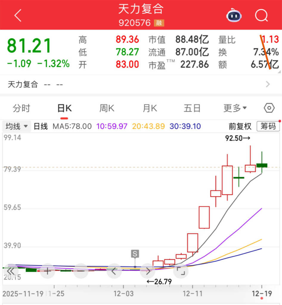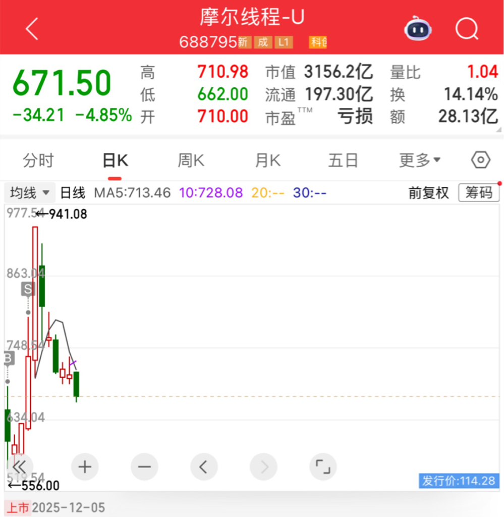2.但是分析和一些信息发现,摩尔上市后会有一波拉升,遂心动,想要短线套利,在摩尔上市的前一天,卖出天力腾资金,杀入摩尔进行短线套利,计划待套利结束继续回天力潜伏,结果天力在我卖出当晚低位发布减持公告,我知道粗问题了,可能回不去了,果然之后一路拉升不给上车了