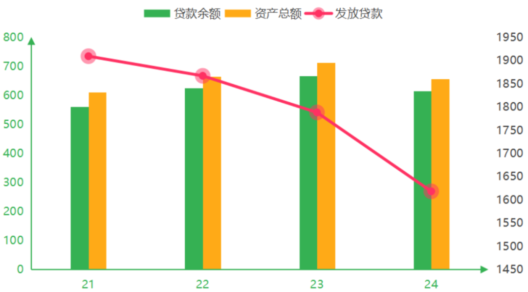 2024年,公司总资产655.6亿元,同比减少8.03%;全年发放贷款1618.2亿元,同比减少9.5%;贷款余额615.44亿元,同比减少7.5%。