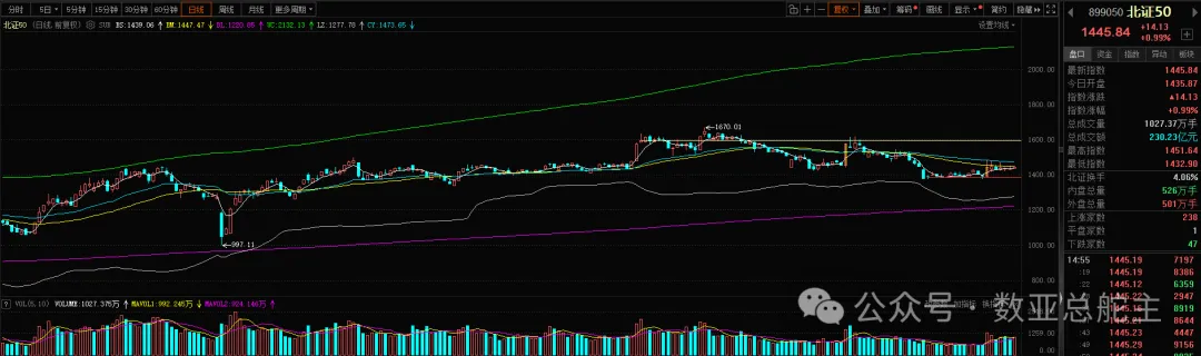 北证50今天微涨,上穿白线,收在黄线下,白线紫线上。