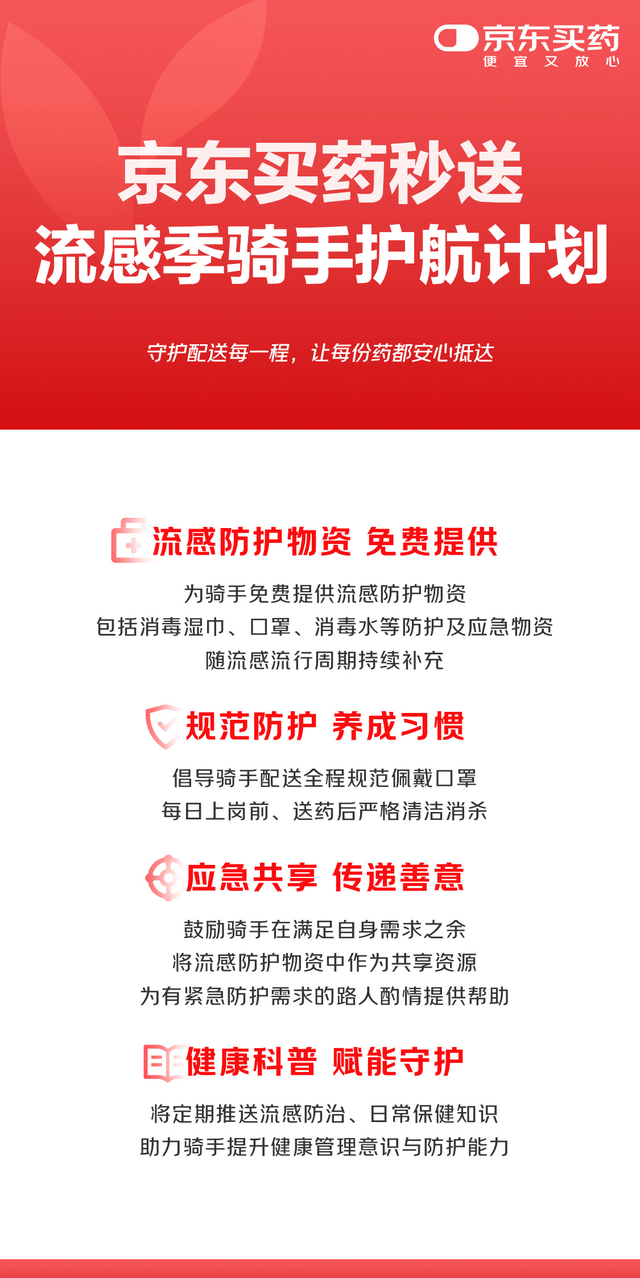 京东买药秒送的“流感季骑手护航计划”,是出于对骑手群体健康安全的切实关怀,而落点则是对配送安全与用户健康的双重责任。通过筑牢配送“最后一公里”的安全防线,让每一份药品在送达过程中多一重防护、多一份安心,为用户提供一份全程可控的安心保障。这个流感季,京东买药秒送以扎实行动,让“放心买药、安心送达”成为可以感知的服务温度。