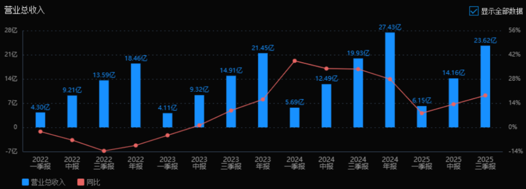 2025年三季度的营业总收入为23.62亿元,相较于2024年三季度的19.93亿元增长了18.49%。收入持续增长,表明公司业务规模在稳步扩张,但增速相比去年同期的33.67%有所放缓,可能面临一定的市场压力或竞争加剧。