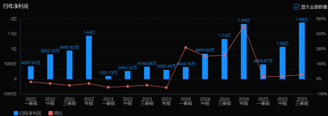 2025年三季度的归母净利润为1.88亿元,相较于2024年三季度的1.33亿元增长了40.99%。净利润增速显著高于收入增速,说明公司在成本控制或盈利能力方面有所提升,净利润增长表现强劲。