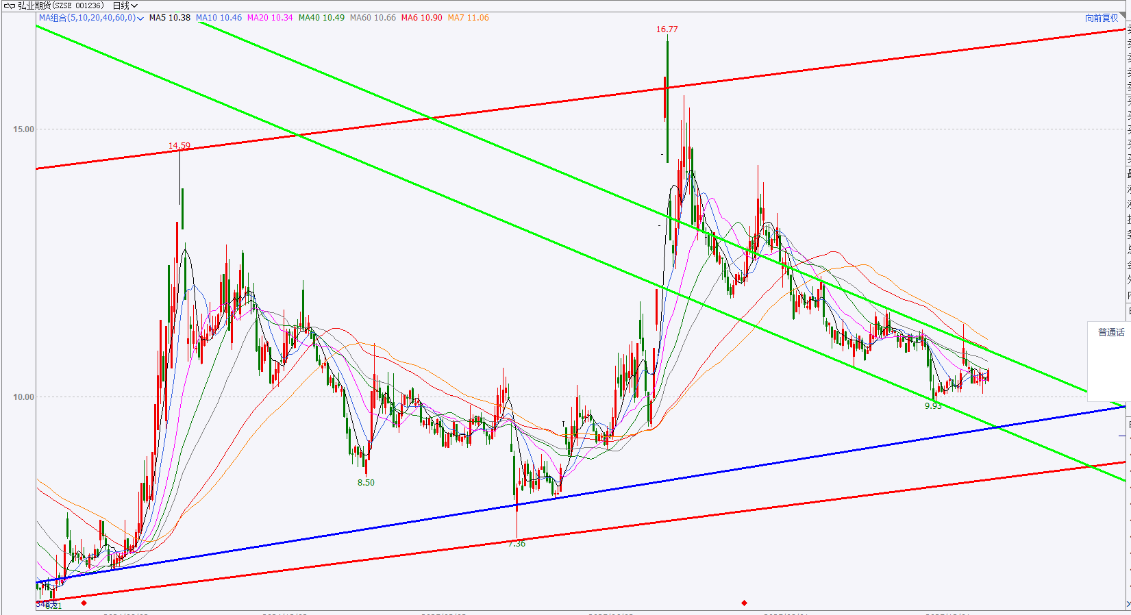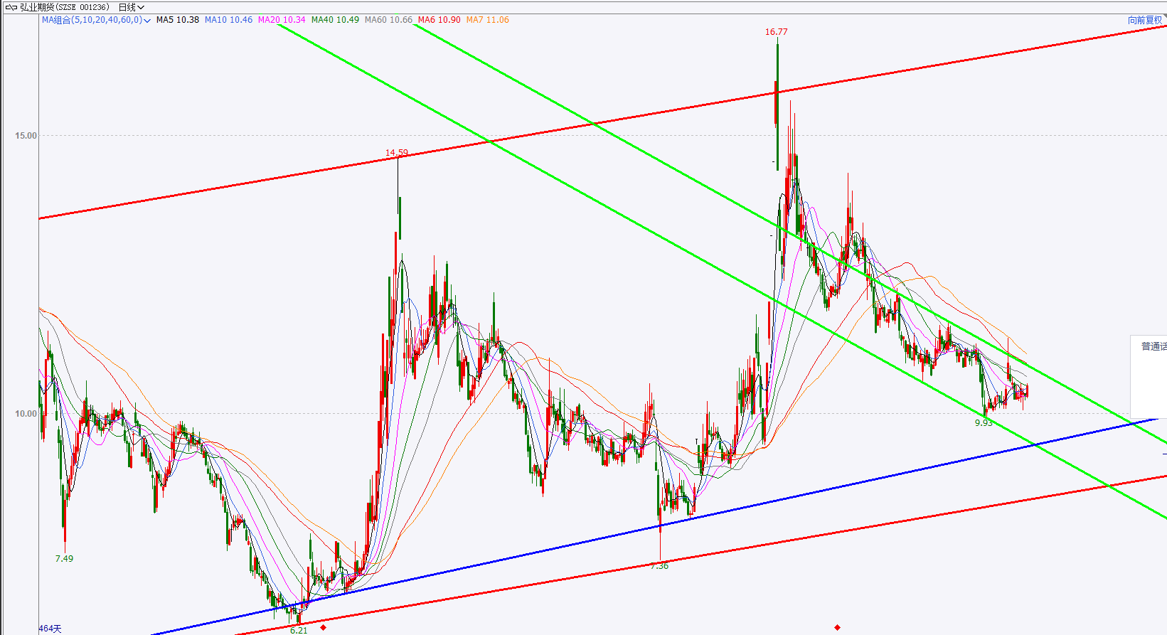 2、根据绿色阻支区间和蓝色的支撑线相交,得出投资标的很有可能在9.4~9.8之间止跌。