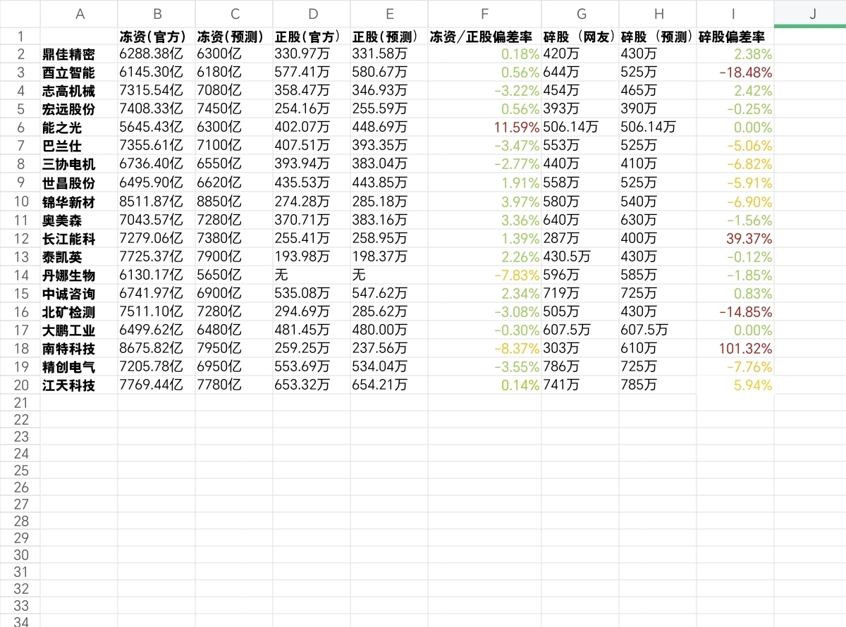 前天,江天科技公告了新股发行结果,冻资为7769.44亿,分解到正股为653.32万。而我预测的冻资和正股分别为7780亿和654.21万,偏差率0.14%;又综合网友数据,碎股约为741万,我的预测值为785万,偏差率5.94%。正股偏差率进入绿区,碎股偏差率则进入黄区。