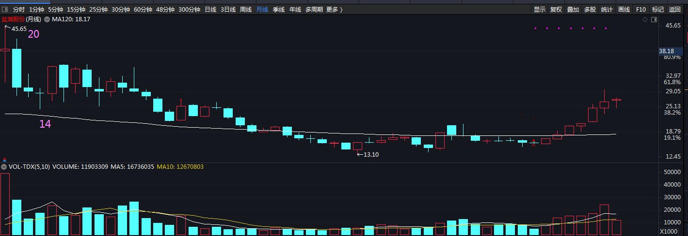 图中是盐湖的月线,从月线角度来说,如果是投资就是在跌破120月线之后开始定投方式,一般定投用金字塔方式分配资金就可以了,越跌越买,比如盐湖,跌破120月月线的价格是19.45左右,那么用这个价格为基准,没跌破5个点就加仓就好了,为了方便计算,假设合计要投入100万资金,那么下跌5个点是18.47,那么18.47买入10万元,17.55买入20万元,16.67买入30万元,15.83买入40万元,做为防止风险,另外备用50万元,极限下跌使用加仓,极限按照继续下跌10个点考虑,就是在14.24再买入50万元,这样布局就算完成,当然左侧交易也要防止风险,由于21年恢复上市的高点是45.65,那么按照盈亏比2比一的原则,合计成本大约在16.5元附近,45.65是16.5的2.76倍,那么从投资角度来说止损就放在11.9元附近(投资而不是投机!)那么止盈到45.65部分至少要把本金从账户中腾挪出来,至于后面的价值,用利润奔跑就好了