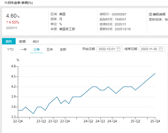 美国11月失业率升至4.6%,大幅超出预期和前值