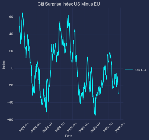 美欧花旗经济意外指数差值:走弱明显