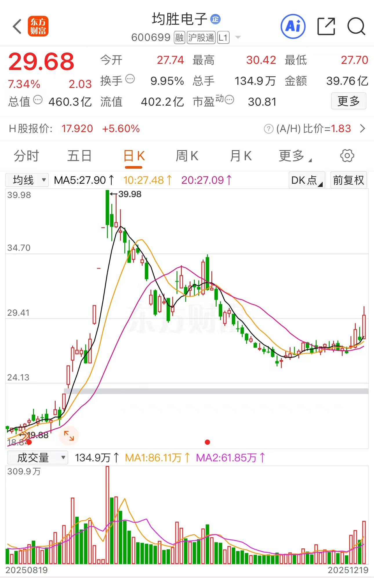 从K线上看,均胜电子从最高点39.98一路调整下来,目前调整的是很充分了,周五放量大涨,后续继续涨的概率也很大。