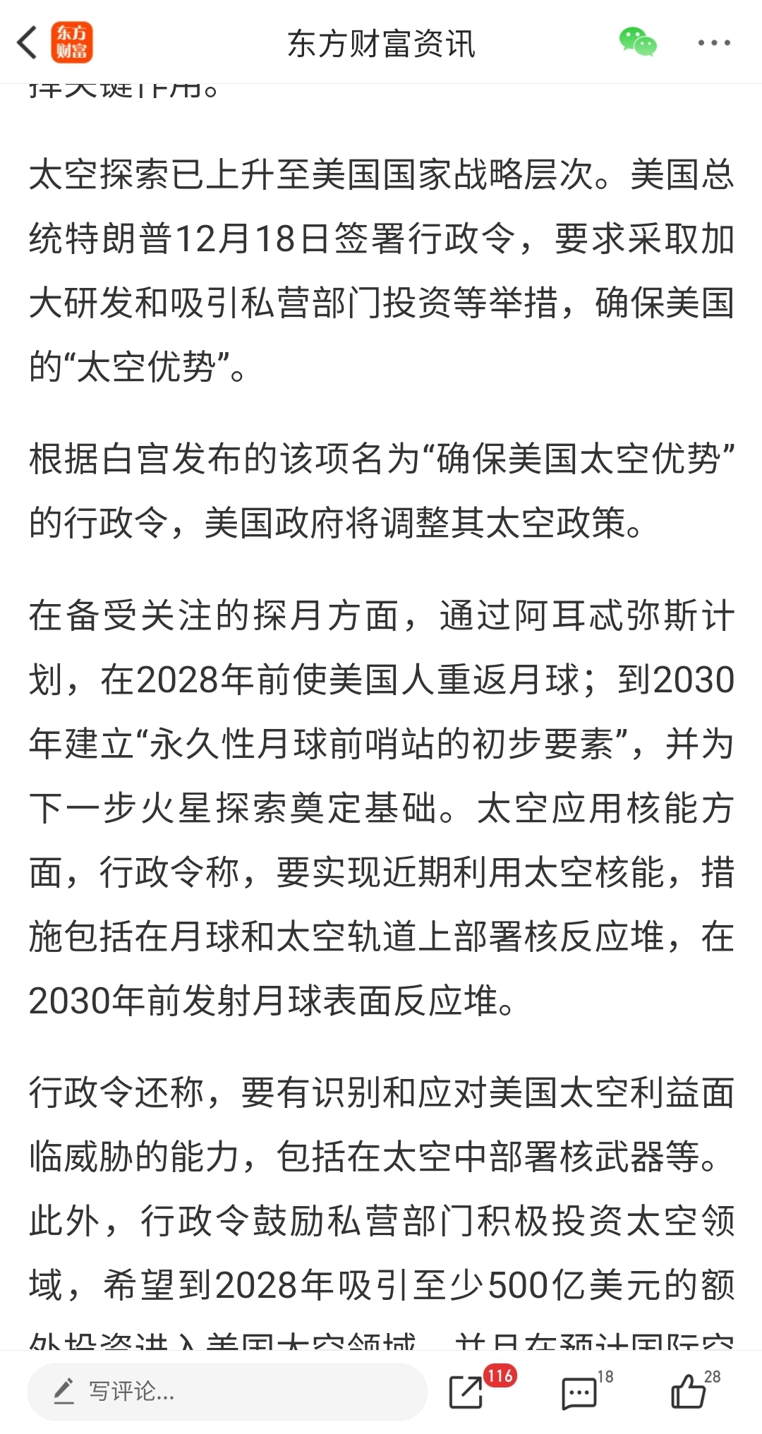 我认为可能21世纪的新一轮军备竞赛(lengzhan)要开始了。现在比的是太空管辖和太空核打击的能力。谁先占领,谁就有控制权。所以美丽国接下来要发射数万颗卫星,2028年还要登月。我们也肯定不能落后,太空太关键了,落后就要挨打。美丽国的AI硬件领先并不能化作热武器,但太空核打击能。我们可以由着他们AI硬件领先,但绝不可能忍着让他们太空核打击能力领先。太空题材不是一般宏大,关系到世界秩序的确认。而且月球上有资源丰富的水冰,还有用不完核聚变材料氦3,谁先占领谁先收益。20世纪美丽国导演的登月把苏阿联吓n了,21世纪谁将主导太空、征服月球?而作为太空能源心脏的核心概念股国晟将会有什么样的表现呢?我们拭目以待。