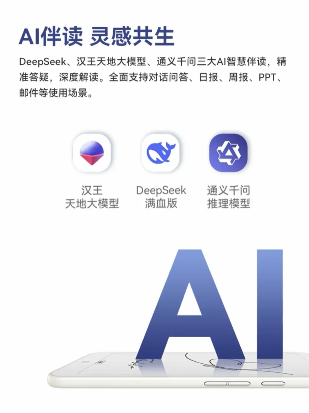 内置汉王自研天地大模型,并协同DeepSeek、通义千问三大AI智慧伴读矩阵,为用户提供精准答疑、深度解读及内容创作等全方位支持。