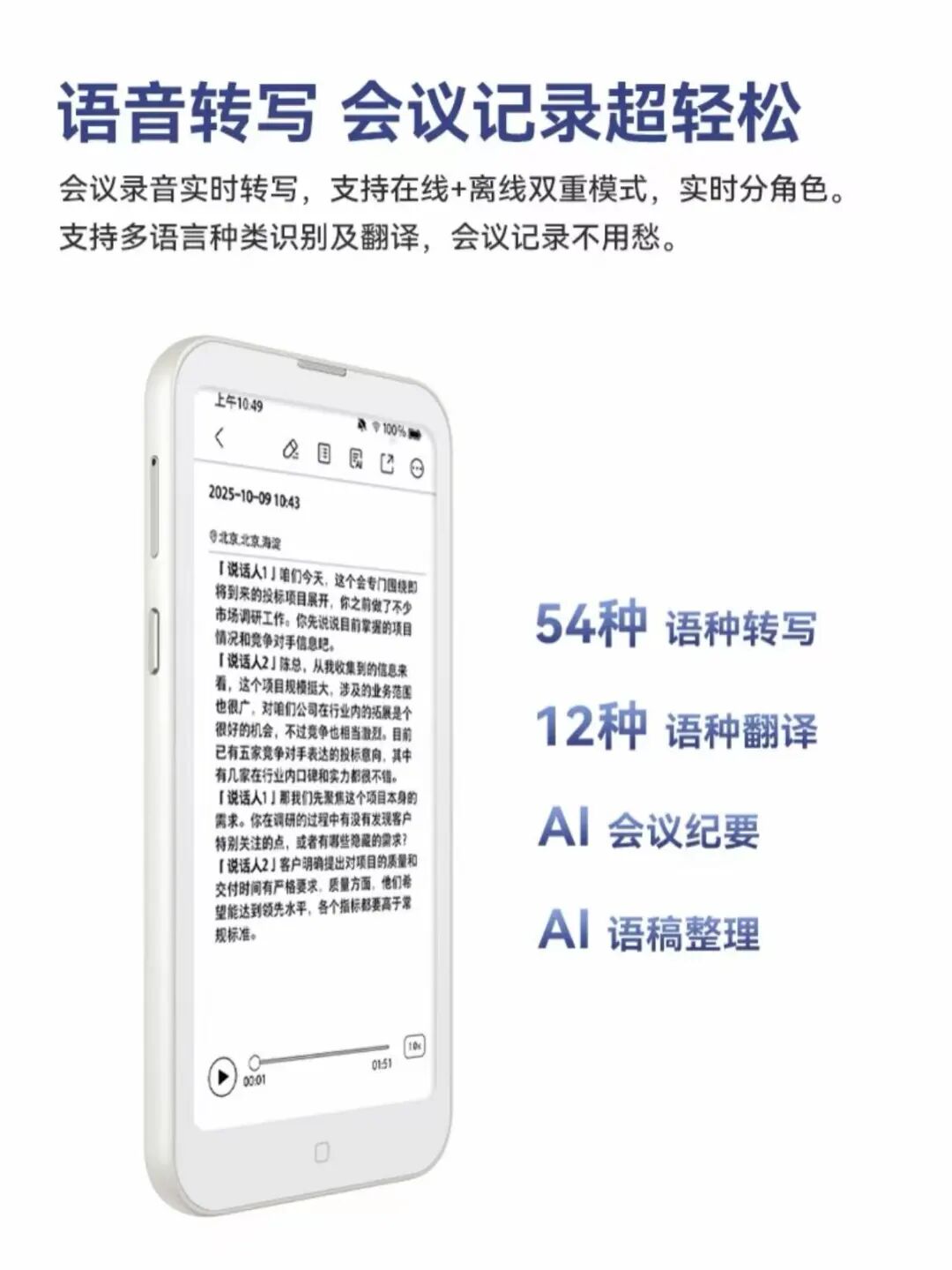 搭载自研语音AI引擎,其远场语音识别技术能够在复杂环境中精准捕捉指令,多种语言、复杂场景依然能保持语音转写精准性。