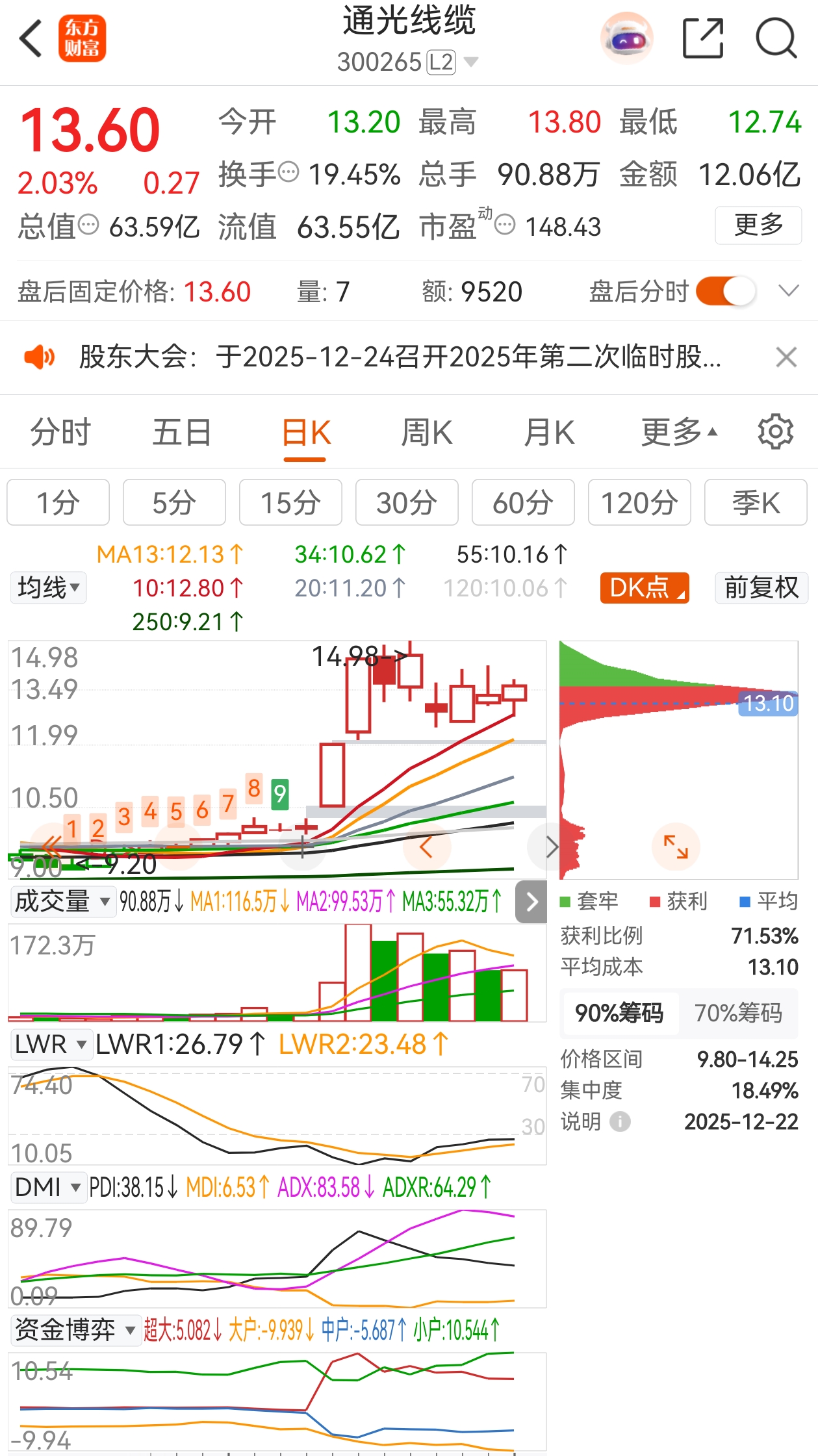 通光线缆:大阳后回调 6 日,今日杀到 10 日线是买点,可惜没有收阴,收阴买点更好,可是收阳也好吧,形成多方炮组合,也不错。留意前大阳高度止盈,杀到 13 线再杀入机会。